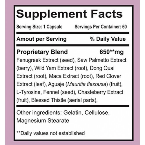 葫芦巴提取物(种子),锯棕榈提取物(浆果),野山药提取物(根),东奎提取物(根),苹果提取物(根),红三叶草提取物(叶),Aguaje(毛果毛果) - 酪氨酸,茴香(种子),越桔提取物(水果),祝福蓟(地上部分)。其他成分:明胶,纤维素,硬脂酸镁
